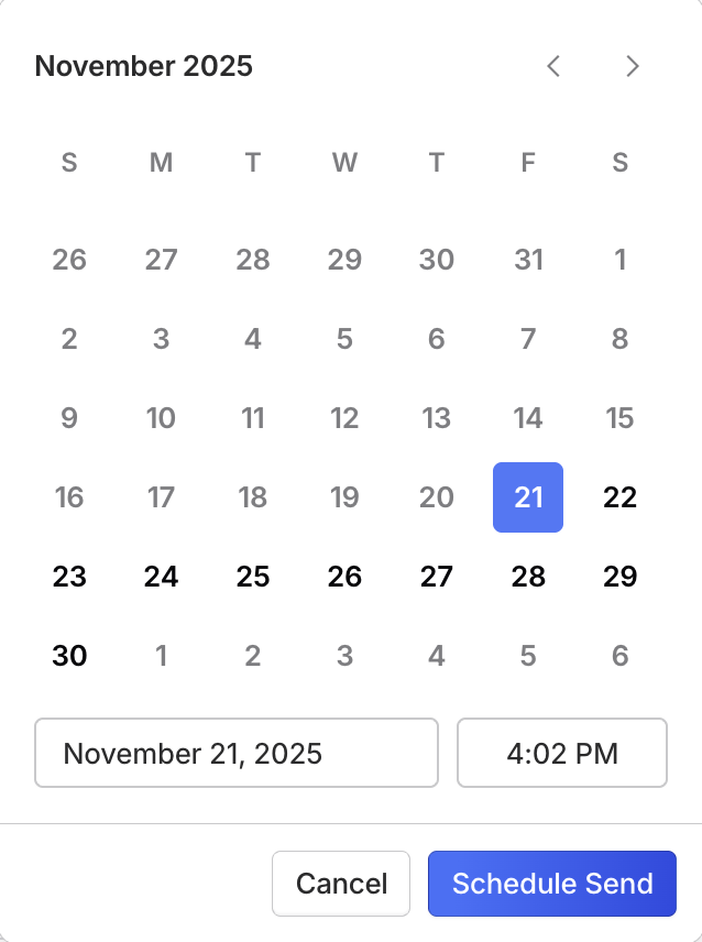 Use Schedule Send when you want your campaign to go out at a specific time instead of immediately. Wherever you see the Schedule Send option:- Click the caret next to the primary send button to open scheduling options