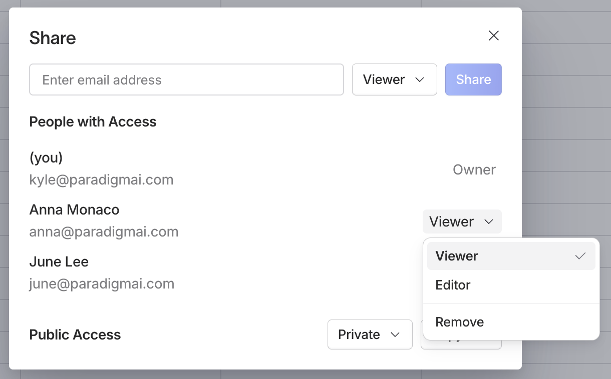 at the top right corner of a sheet. From this panel, you can add and remove users and change their editing premissions.