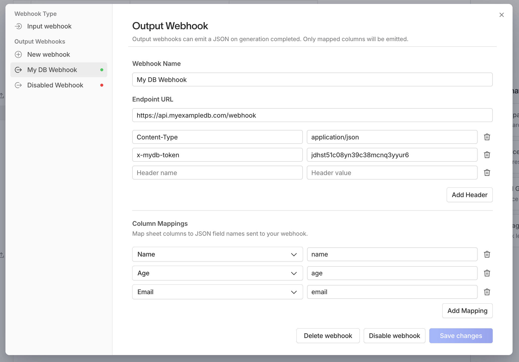 Output webhooks are the destinations where Paradigm will send the data from your sheet. Unlike input webhooks, you can have as many output webhooks per sheet as you want. They are triggered when any cell in the sheet gets enriched. Upon triggering, the corresponding row gets sent to all active output webhooks for the sheet. To use an output webhook, in the webhooks menu clickNew webhook under the Output Webhooks section of the sidebar, or navigate to one of your existing webhooks for the sheet.