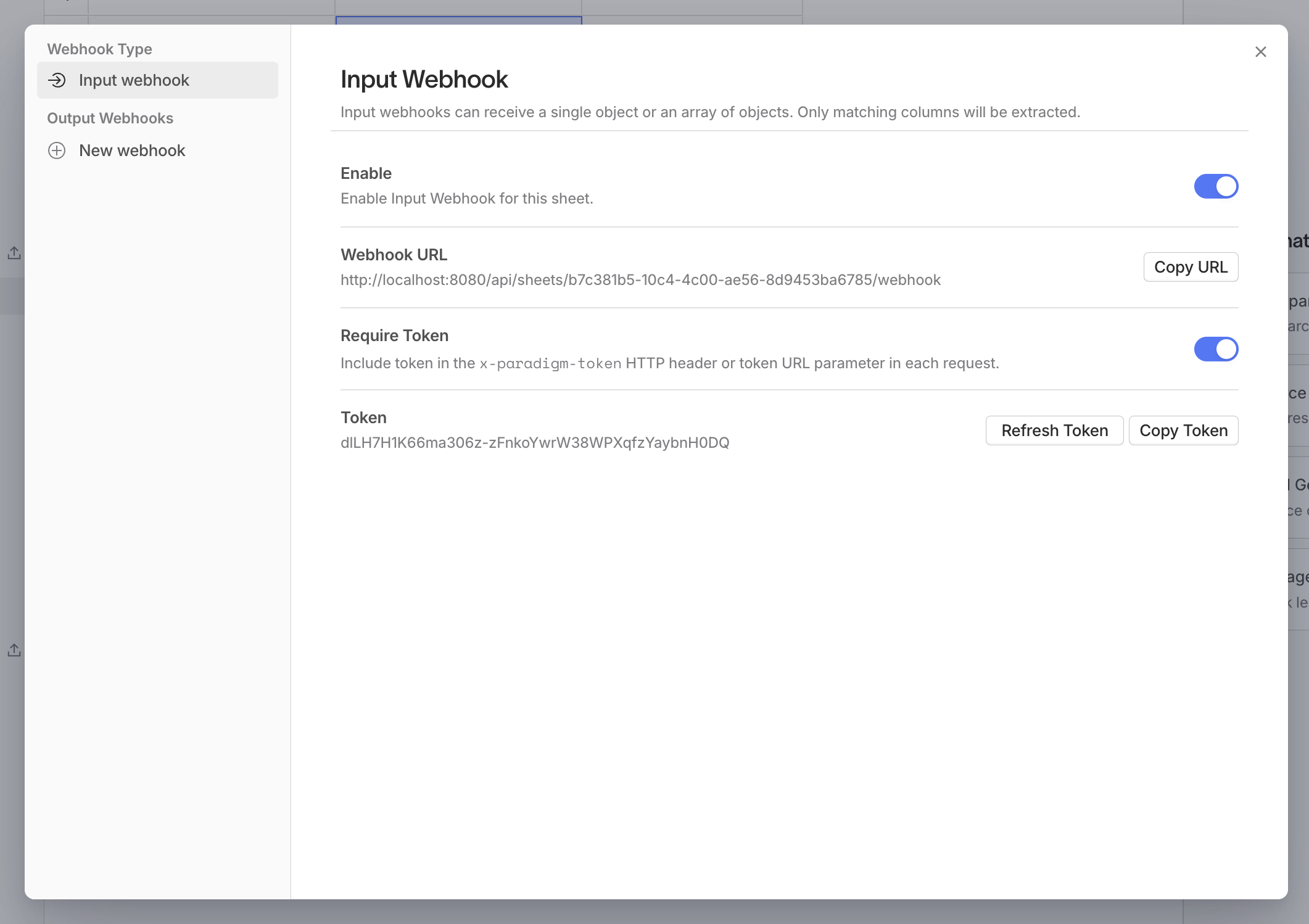 Input webhook tab should be open on the sidebar. Enable the input webhook for your sheet, copy the webhook URL and token, and paste them into your webhook-compatible source. Note that the security token is required by default, but you can choose to turn it off.