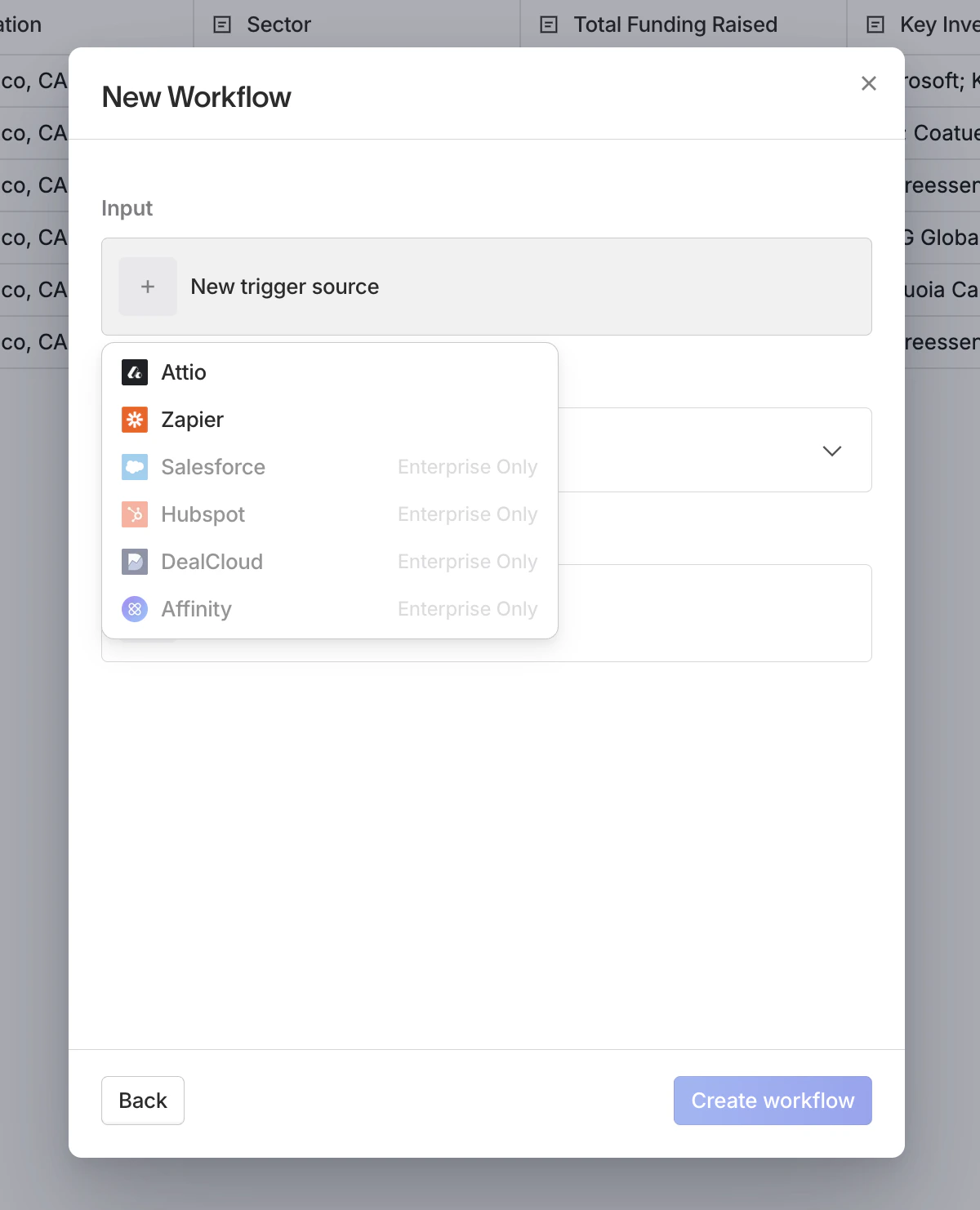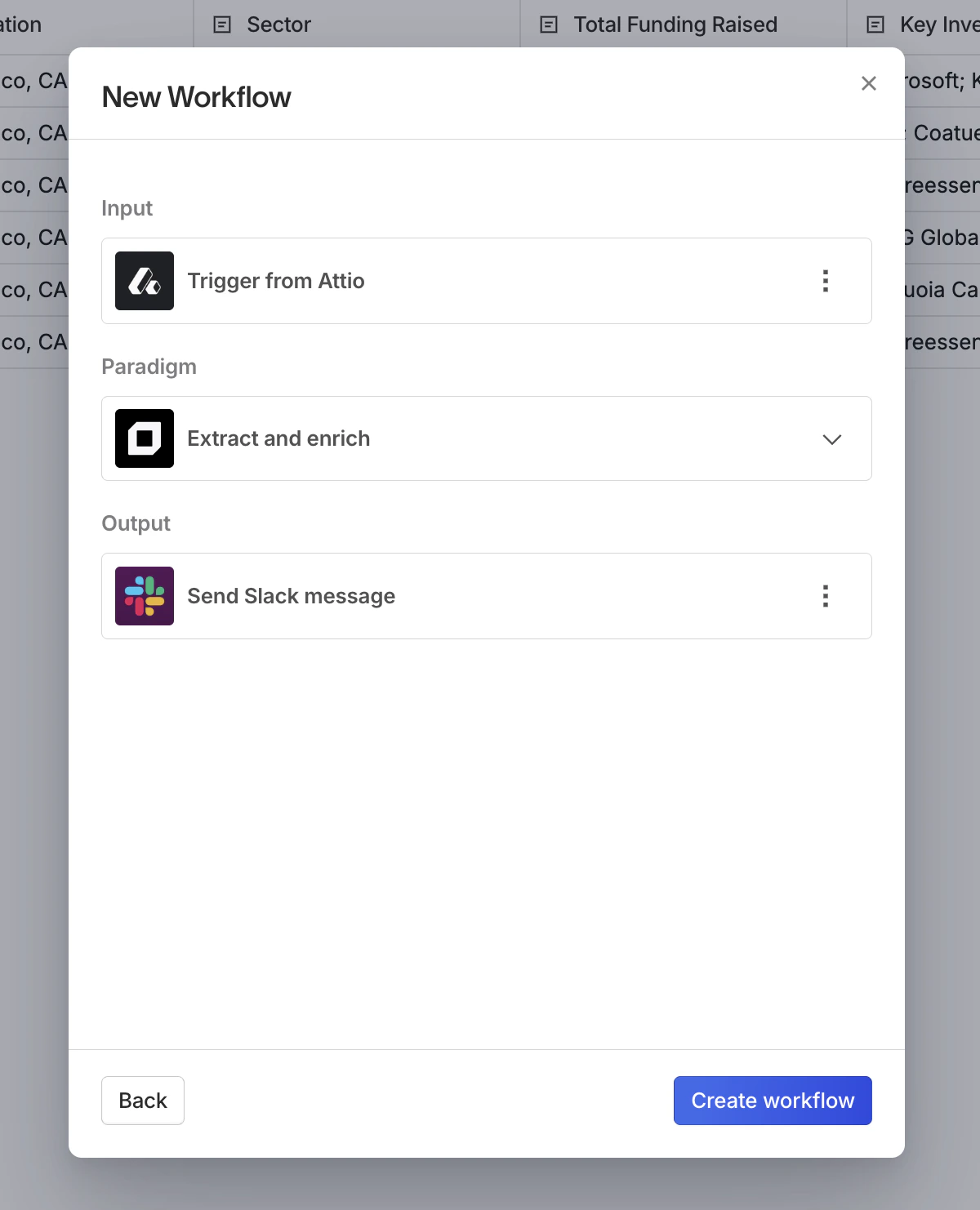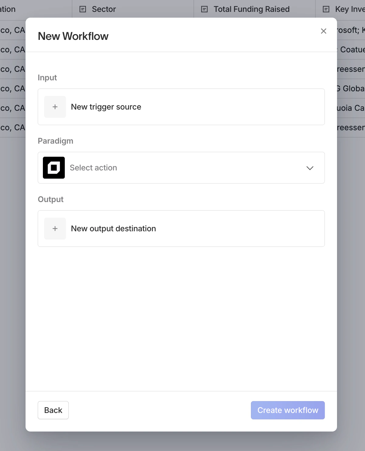 Each workflow has three parts:- Input: a trigger source that sends data to Paradigm (e.g. a CRM update, an incoming email, a Zapier zap)