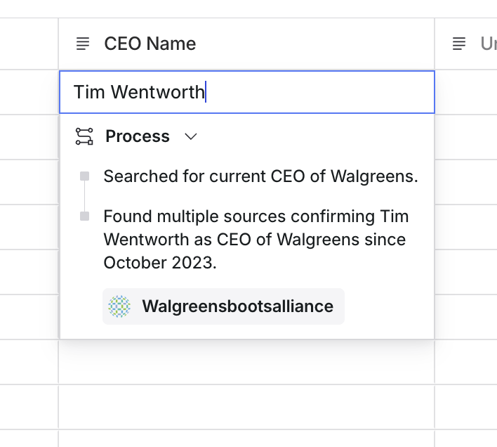 button is now enabled. We can now generate the data for this cell. Double-clicking on a cell reveals the generated data along with the agent’s steps and cited sources.